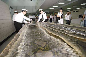 16張數(shù)米長的蟒蛇皮,展開鋪在海關(guān)查驗臺上。日前旅客賴某想走私這些國家一級保護野生動物蟒蛇皮進境牟利,在拱北口岸就被查獲。這些蟒蛇皮每張長度在3~5米左右。這是拱北口岸首次查獲旅客攜帶蟒蛇皮進境走私案。(記者陳治家 通訊員黃慧賢、張建林攝)