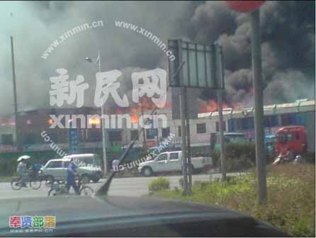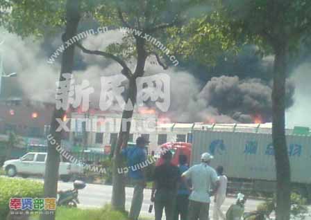 2008年7月17日下午2點(diǎn)30分,新民網(wǎng)接到網(wǎng)友報(bào)料稱,奉賢區(qū)齊賢鎮(zhèn)有工廠大火,預(yù)計(jì)損失2億,現(xiàn)有50多輛消防車(chē)到場(chǎng)。新民網(wǎng)記者電話連線網(wǎng)友楊先生,楊先生稱現(xiàn)場(chǎng)就像原子彈爆炸一樣,天空全黑了。