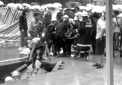 昨天上午9時(shí)50分,鄭州市區(qū)下著雨。郭先生沿敦睦路人行道向北走著,前面是一中年男子和一年輕女子!奥犚娹Z隆一聲響,我前面走的倆人沒影兒了,倆人掉進(jìn)大坑了。”敦睦路周邊有多家大型服裝商場,平日行人如織。
