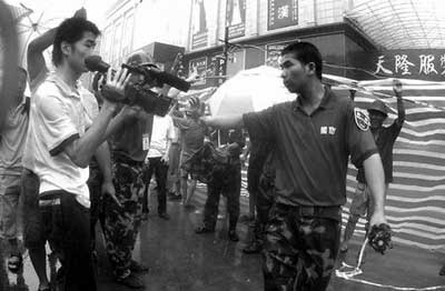 10時(shí)15分,來了20余名穿紅上衣、衣服上標(biāo)有“大同路人防工程”字樣的年輕男子,阻撓記者采訪。拿手機(jī)拍照的群眾也遭到威脅。河南日?qǐng)?bào)記者在拍照時(shí),六七名紅衣男子上前,揪住記者上衣領(lǐng)口,反扭其雙手,往機(jī)動(dòng)車道上推搡,記者的上衣被撕爛。市民紛紛指責(zé)這些紅衣男子,不去救人,反而扭打記者。