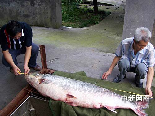 中新網(wǎng)杭州7月20日電(記者龔讀法 通訊員龔一磊) 日前,浙江省杭州千島湖發(fā)展有限公司捕撈隊(duì)在千島湖宅上攔網(wǎng)上捕獲特大鱤鰍魚一條.該魚長(zhǎng)165cm,胸圍91cm,重54公斤,是近年來捕獲的最大鱤鰍魚,同時(shí)也是今年以來千島湖內(nèi)捕獲的第三條超百斤的大魚。目前,該鱤鰍魚已送上海水產(chǎn)大學(xué)制作標(biāo)本。