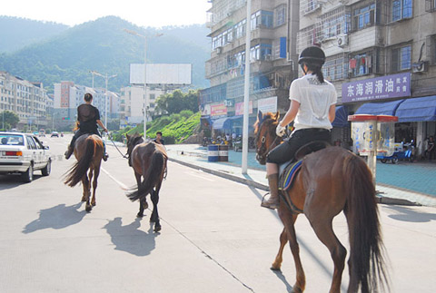 連日來的傍晚時(shí)分,只要天氣晴好,(浙江)諸暨最繁華的街區(qū)就會(huì)出現(xiàn)這樣一副場(chǎng)景:兩三名時(shí)尚男女,身穿騎師服裝,騎著高頭大馬,旁若無人地在車流中穿行。途經(jīng)之處,總引得好奇市民拿起手機(jī)、相機(jī)一通抓拍。