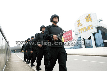 幾名頭戴防彈頭盔、身穿防刺背心、手握微型沖鋒槍全副武裝的民警,威風(fēng)凜凜地從人群中走過,和其他民警不一樣的是,他們手臂上戴著寫有“昆明特警”醒目字樣的袖章。按省公安廳和市公安局的要求,從前天下午3點(diǎn)開始,昆明市公安局特種警察支隊(duì)進(jìn)駐昆明機(jī)場(chǎng)、火車站及各大汽車客運(yùn)站,開始不間斷的武裝巡邏。