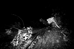 由于停電,整個土主鎮(zhèn)一片漆黑,村民們用手電筒掃攝路邊的房屋,只見一路上很多民房都成了“禿頂”,樹木東倒西歪,大部分房屋前都散落著被風吹倒的紅磚塊,不少小路也因樹木的斷裂而無法通過。