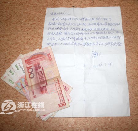 “今天早上查房的時候,我們發(fā)現(xiàn)曉濤的家長一個也不在。先還以為他爸爸上班去了,但后來在他床頭發(fā)現(xiàn)了這樣一個信封!笔罕齻慰频闹蛋嘧o(hù)士遞給記者一個信封。拆開一看,里面有一封曉濤父母的手寫書信和四百元人民幣。在信中,他們稱為曉濤治病已花去4萬余元,其中自己的積蓄有8000元(還有三萬余元來自捐款),目前已經(jīng)傾家蕩產(chǎn)、無能為力,故希望社會上有好心人能收養(yǎng)自己的兒子。