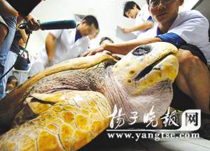 昨天上午9點(diǎn)鐘,海底世界搭起的手術(shù)室里十分安靜,呈現(xiàn)出土黃色的大海龜一動(dòng)不動(dòng)地趴在地上。“吼,吼”,低沉而又艱難的呼吸聲讓人感覺(jué)到它異常痛苦。