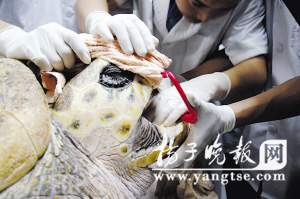 南京海底世界300歲的老壽星——蠵龜(xīguī),由于舌部長(zhǎng)出惡性腫瘤導(dǎo)致進(jìn)食和呼吸極端困難。海底世界的幾位外籍專(zhuān)家經(jīng)過(guò)會(huì)診后,決定手術(shù)切除這個(gè)腫瘤。