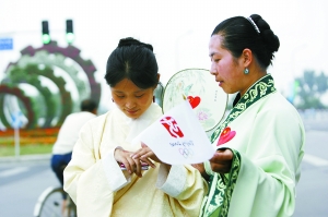 她的同伴,北京聯(lián)合大學(xué)大二的學(xué)生吳佳嫻,手上印有北京奧運(yùn)的徽章,漢服上貼有心形國(guó)旗圖樣。她和豐茂華是“漢網(wǎng)”(漢服愛(ài)好者交流的網(wǎng)站)的網(wǎng)友。二人穿著的漢服是到專門服裝店訂做的。