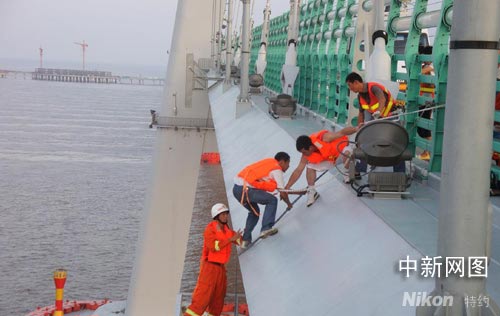 中新網(wǎng)寧波8月22日電(見習(xí)記者 何蔣勇 通訊員 張文榮)21日16時(shí)50分,位于杭州灣跨海大橋南航道位置,大橋養(yǎng)護(hù)中心的3名工作人員在大橋箱梁下面的檢修車上作業(yè)時(shí)被困。半小時(shí)后,三人被安全救出。 這也是世界第一跨海大橋——杭州灣跨海大橋上發(fā)生的第一次救人行動(dòng)。