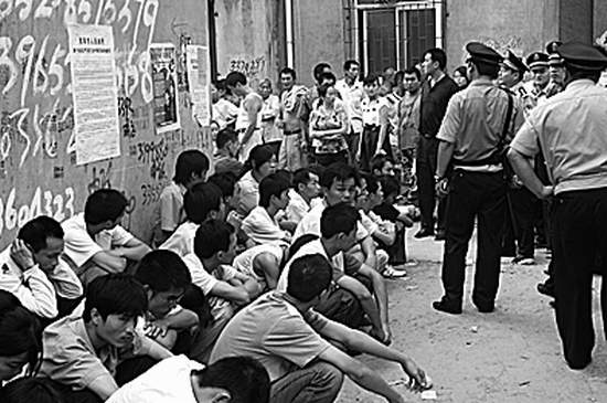 記者隨同民警清查時(shí)發(fā)現(xiàn),樓房內(nèi)幾乎每個(gè)房間都是房門緊鎖,任由外面的民警怎么敲門,里面的人就是不開門。在二樓的一個(gè)房間外,民警敲門足足幾分鐘始終無人開門,于是將門鎖撬開進(jìn)入,發(fā)現(xiàn)簡(jiǎn)陋的客廳里,靠四周墻壁坐著20多個(gè)年輕人,男的占大多數(shù)。