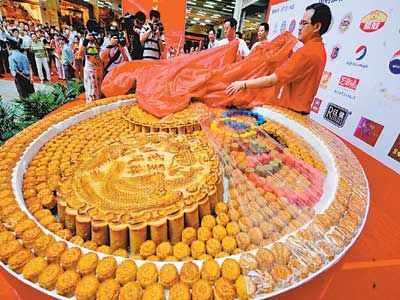 來自四川新都冠生園的月餅王有400斤重,直徑1.4米,取名祈福大月餅,由8個來自廣東和香港的師傅精心制作了7小時而成,專門從成都新都運過來。