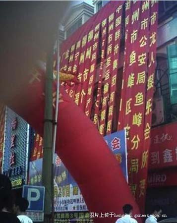 8月28日,位于柳州市文惠橋南頭的一家夜總會(huì)開(kāi)業(yè)。三天后,網(wǎng)友“fox_nn:”在紅豆社區(qū)柳州論壇上發(fā)帖并配上圖片。圖片上夜總會(huì)開(kāi)業(yè)的祝賀條幅,幾乎把整個(gè)樓房都蓋住了,其中最引注目的,是標(biāo)注柳州市魚(yú)峰區(qū)政府及柳州市魚(yú)峰區(qū)公安分局祝賀的條幅。