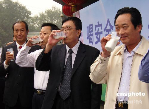 9月25日,石家莊市副市長張殿奎(右二)帶頭將滿滿一大杯某品牌純牛奶一飲而盡,隨行的石家莊市工商局、質(zhì)量技術(shù)監(jiān)督局、商務(wù)局等相關(guān)部門負責人也紛紛效仿,將手中品牌各異的滿杯純牛奶全部喝下,以消除此間民眾因三鹿問題奶粉事件而產(chǎn)生的顧慮。中新社發(fā) 牛琳 攝