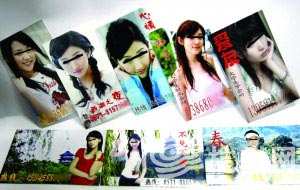 孫朱夫婦買(mǎi)了十多張手機(jī)卡和十多只小靈通。找了家地下作坊,花600多元,制作了1萬(wàn)余張印有漂亮女孩的招嫖名片。