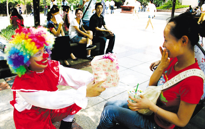 “小姐,你好,請接受我的禮物……”昨日中午,在沙區(qū)三峽廣場,一名穿著紅色小丑服,手拿一盒包裝好的禮物,單膝下跪在一名漂亮女子面前。為了逗女孩開心,他還唱起《兩只老虎》,惹得路人哈哈大笑。然而,那名女子的神情卻非常驚訝……原來,小丑是一家道歉公司的員工,正按客人要求給人道歉。記者了解到,湖南男子彭敏于上月成立的“重慶快樂家族公司”,是本市首家專門幫人道歉的公司。