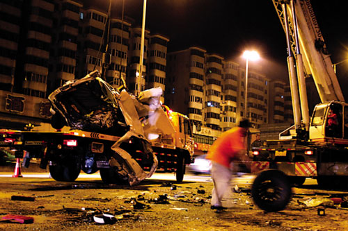 今天凌晨1時30分左右,廣州黃埔大道華僑醫(yī)院對出位置發(fā)生重大車禍,一輛面包車撞上一輛在修的槽罐車后,再撞水泥攪拌車,記者在現(xiàn)場看到四具尸體。警方今早確認事故造成四人死亡。