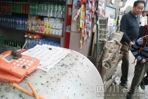 干雜店老板張敏不斷地從屋里掃出泥水。據(jù)她說,下午3點(diǎn)20分左右,她正在店里清理商品,忽然聽到“砰”的一聲巨響,然后就聽到“轟轟”的聲音,緊接著飄來濃濃的刺鼻氣味。張敏忙往外一看,離店鋪僅兩米印有“成都排水”字樣的綠色施工防護(hù)墻不斷晃動(dòng),沙石隨著黑色的煙霧直沖進(jìn)屋子,“我以為又地震了!睆埫翥读俗阕阋环侄噻,才想起來要往外跑。跑到門口時(shí),她看到整條街上一個(gè)行人都沒有了,其他店鋪的商家已往安全地帶跑去,慌亂之際,她來不及拉上卷簾門便直接往一環(huán)路方向跑去。