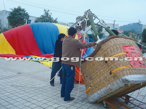 昨日上午,貴陽(yáng)和尚坡水電九局廣場(chǎng)里一片喜慶。記者在現(xiàn)場(chǎng)看到,由紅黃藍(lán)三色組成的熱氣球停在地面上,現(xiàn)場(chǎng)聚集了上百人圍觀。上午7點(diǎn),經(jīng)過(guò)嚴(yán)格培訓(xùn)后具備駕駛熱氣球技能的工作人員來(lái)到廣場(chǎng)上,他們分別對(duì)熱氣球進(jìn)行升空前的檢查工作:一組負(fù)責(zé)檢查熱氣球的整體情況;一組負(fù)責(zé)查看新郎、新娘乘坐的熱氣球竹籃;一組負(fù)責(zé)檢查、調(diào)試加熱設(shè)備!7點(diǎn)40分,方江濤和劉小南乘坐婚禮花車抵達(dá)廣場(chǎng)。由于風(fēng)力較大,熱氣球必須將氣囊鼓足。就在這時(shí),鼓風(fēng)機(jī)很不識(shí)趣的“罷工”了,不論工作人員怎么努力調(diào)試,鼓風(fēng)機(jī)還是一動(dòng)不動(dòng)?吹竭@樣的情形,方江濤只好從花車上跳下來(lái),挽起衣袖檢查機(jī)器。20分鐘過(guò)去了,鼓風(fēng)機(jī)終于“砰砰砰”發(fā)出聲響。在一旁圍觀的群眾打趣說(shuō)道:“看來(lái)這個(gè)即將升空的‘神舟八號(hào)’只有新郎才能搞定呀!”