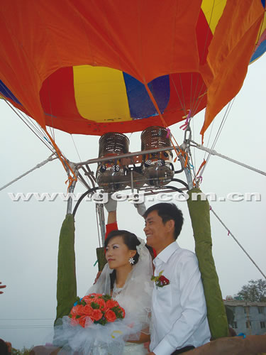 8點(diǎn)20分,新郎方江濤和新娘劉小南坐進(jìn)1米高的竹籃里,乘坐被4根繩子拽著的色彩鮮艷的熱氣球慢慢升空了。1米、2米……熱氣球在掌聲中一點(diǎn)點(diǎn)離開(kāi)地面,新人的臉上也充滿了喜悅和興奮,新娘向地面不住地舞動(dòng)著手臂,新郎也不時(shí)地替新娘整理被風(fēng)吹起的秀發(fā)。大約10分鐘,熱氣球升高到50米左右后,漸漸下落回到地面。