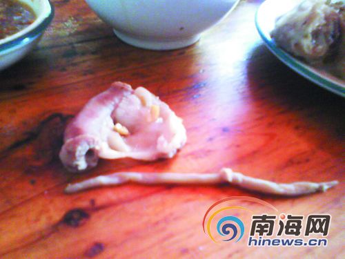 大家吃了一陣后,同桌的一位女士又加了份粉腸。而當(dāng)大家準(zhǔn)備動(dòng)筷進(jìn)吃粉腸時(shí),突然發(fā)現(xiàn)其中一截粉腸兩端竟然露出異物,用筷子夾出來一看,竟然是條長(zhǎng)約9厘米的寄生蟲。大家當(dāng)時(shí)都惡心不已,其中一位女士更是跑到一邊嘔吐不止。