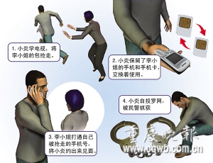 一男孩搶走一女孩手機(jī),還將搶來(lái)的手機(jī)卡和自己的換來(lái)?yè)Q去地用。被搶女孩打通自己的電話,自稱朋友約搶匪見面,搶匪信以為真,結(jié)果自投羅網(wǎng)。