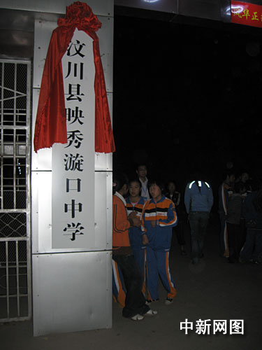 來到學(xué)校天已擦黑,校門口掛著“汶川縣映秀璇口中學(xué)”的牌子,汶川——這個(gè)屬于四川的地名,這個(gè)因?yàn)槟菆鼍薮鬄?zāi)難而舉世周知的地名,出現(xiàn)在這里,無疑有著特殊的意味。而那塊經(jīng)歷過覆頂之災(zāi)的校牌,則以嶄新的面貌出現(xiàn)在這里——掛在上的紅綢依然還很鮮艷。同學(xué)們穿著校服,見到前來的記者們,好奇地簇?fù)碇^看!案绺缃憬愫谩保⒆觽兒苡卸Y貌地打著招呼,青春的校園在不上課的時(shí)候永遠(yuǎn)是喧嚷熱鬧的。