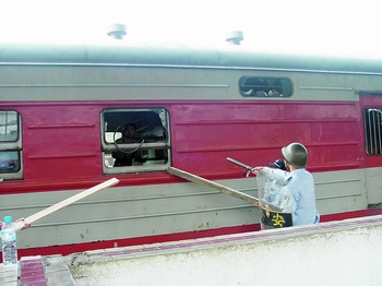 昨日清晨6時(shí)57分,由廣州開往長沙的5362次列車到達(dá)長沙車站,?吭谌九_五道。長沙車站派出所民警戴戈與列車乘警辦理完交接手續(xù)后,接到該車行李員陽小華報(bào)告,稱當(dāng)日6時(shí)許,該次列車到達(dá)株洲裝卸完行李準(zhǔn)備開車時(shí),突然沖上來一名穿白T恤的中年男子,“撲通”一聲跪倒在他面前,稱有人追殺他。同時(shí),該男子手持深圳至婁底的車票。男子上車后一直躲在行李后,充滿恐懼,經(jīng)行李員多方勸解無果。列車終到長沙車站后,該男子將行李員趕下車廂,將行李車廂的正門反鎖,將通道門用貨物堆碼封閉,并手持一根釘有鐵釘、長1.5米的粗木棒揮舞,不許任何人靠近。