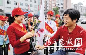 昨天,在泰州高港區(qū)活躍著兩支共30人的“文明使者”隊(duì)伍,手拿鮮花的“文明使者”,不時(shí)有選擇地將鮮花送給一些“特殊”市民,讓人吃驚的是,有幸被送鮮花的市民每人都有不文明的行為,這些市民接受鮮花后先是尷尬,再就立即改正自己不文明的行為,很多人還當(dāng)場(chǎng)表示以后再也不會(huì)犯同樣的錯(cuò)誤了。當(dāng)天,共有500市民接受了這樣特殊的“文明教育”。