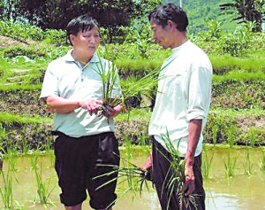 何繼華(左)生前在田里指導(dǎo)農(nóng)民種植水稻。