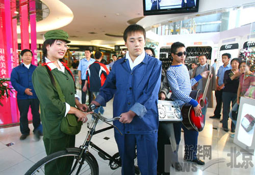 其中,一個代表上世紀(jì)70年代工人形象的男士身穿一身藍(lán)色工作服,推著一輛老式“永久牌”自行車,展示著當(dāng)年的“流行風(fēng)尚”;一個小伙子身穿;晟馈⒋髦蝮$R,手彈吉他,邊走邊唱,這是上世紀(jì)80年代時尚潮流青年的形象再現(xiàn)。