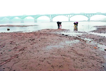 昨日,湘江長(zhǎng)沙段水位降至26米,兩名女子正在湘江江灘上撿螺。小劉軍攝
