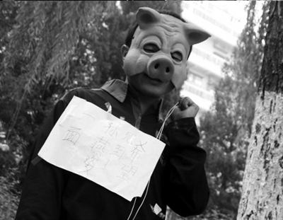 昨天上午8點(diǎn),一名頭戴豬頭面具的男青年跪在朝陽(yáng)體育館東門(mén)對(duì)面的人行道上,胸前和身后各貼一張白紙,上面用綠色水彩筆寫(xiě)著“希望見(jiàn)孫燕姿一面”。男子稱(chēng),他姓劉,“今年20多歲”,來(lái)自云南。他說(shuō),他從8年前開(kāi)始喜歡孫燕姿,想用這種“特別一點(diǎn)”的做法給自己一個(gè)交代。他稱(chēng)對(duì)見(jiàn)到孫燕姿不抱希望,重要的是表達(dá)喜歡的心情。
