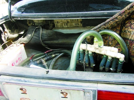 “為了避人耳目,大鐵箱被用布蓋著。鐵箱上連著直徑有5厘米粗、內(nèi)有鐵絲的硬質(zhì)塑料管,五六米長(zhǎng)的管子上安裝有閥門、連接有油泵、進(jìn)出油過濾油器、開關(guān)等。原來轎車就是用這根‘長(zhǎng)鼻子’把大貨車的油偷走了。”李靖明說。