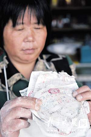 10月13日上午,當(dāng)記者來到朱湖鎮(zhèn)時(shí),由于沒有掛牌,幾經(jīng)打聽之下才在一個(gè)大院內(nèi)找到了鎮(zhèn)政府。在馬路對面,有一排門面房,其中有大部分是賣油米面的門市,只有兩家是出售煙酒等雜貨的小賣部,其中一家已經(jīng)關(guān)門。當(dāng)記者找到另一家時(shí),才知道這里就是吳長貴開的店,只是他本人不在,吳的妻子在店里包餃子。得知記者是來采訪鎮(zhèn)政府欠債的,吳妻放下手中的餃子皮,來不及擦手,就從柜臺下面摸出了一沓發(fā)票,由于已經(jīng)存放了10年,這些發(fā)票已經(jīng)發(fā)黃、破損,但上面的字跡依然清晰可見!耙还彩嵌f六千塊錢!”老板娘告訴記者。