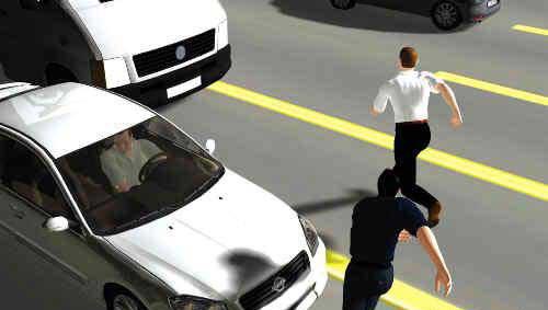 據(jù)轎車(chē)司機(jī)馮先生稱(chēng),當(dāng)時(shí)他正行駛在靠中間綠化帶的小客車(chē)車(chē)道上!爱(dāng)時(shí)車(chē)輛很多,我開(kāi)得并不快。突然,車(chē)輛左前方跑過(guò)一名拿著警棍的男子,我緊急剎車(chē)還是把他撞倒了,隨后一旁車(chē)道的一輛中型貨車(chē)剎車(chē)不及把他壓在車(chē)輪下!薄翱此袷窃谧汾s什么人,而且跑得很快,甩出來(lái)的警棍把我的車(chē)前窗擋風(fēng)玻璃都撞裂了!瘪T先生說(shuō)。
