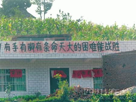 石光武是兩條標語的原創(chuàng)者之一,另一位原創(chuàng)者是棗樹村村委會主任雍明。“地震后,大家碰面都會說幾句鼓勵打氣的話,我就想選幾句寫成標語,鼓勵大家不等不靠,自己動手重建家園!笔馕涞脑捄土硪痪浔淮迕窠(jīng)常掛在嘴邊的話被雍明選中。7月下旬,“出自己的力,流自己的汗,自己的事情自己干”、“有手有腳有條命,天大的困難能戰(zhàn)勝”兩條標語分別貼在村民尚元進和村民李玉明家墻上。