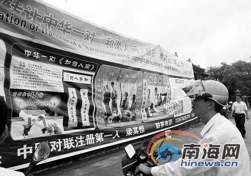 10月30日上午,海口市一農民在海瑞故居前掛起自己專利對聯(lián),稱轉讓對聯(lián)版權3000萬元,并標榜稱:該專利是世界上升值最快的專利產品。這一行為吸引著很多人圍觀,很多市民觀看后說,這個人想錢想瘋了,一副對聯(lián)怎么可能值3000萬元,他不過是在借機會炒作自己。