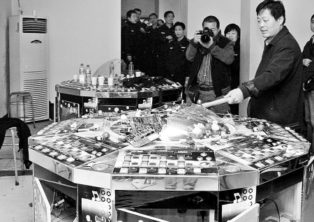 下午3時(shí)20分,記者隨民警來到經(jīng)二路一家沒有任何店名的門面房前。這個賭博窩點(diǎn)已聞訊關(guān)上了防盜門,記者注意到,門外還張貼著招聘服務(wù)員的啟事。民警強(qiáng)行將門打開,只見50多平方米的屋內(nèi)已空無一人,里面擺著30多臺“動物樂園”等3種賭博機(jī)。門口一中年婦女告訴記者,這家賭博廳開業(yè)已有一個月了,“他們害人害己,早該取締了!