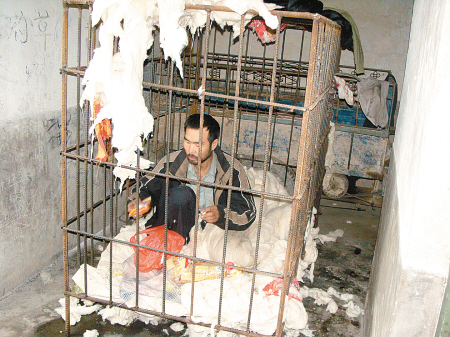 該村村民告訴記者,今年37歲的薛建倉在17歲時遭遇搶劫受到強烈刺激,患上精神分裂癥,十多年前其父因病去世,母親半身不遂臥病在床,薛建倉現(xiàn)由他的大姐照顧。2006年6月,薛建倉病發(fā)時將叔叔砍死,今年8月份,他又發(fā)病,一把火將自家房屋燒毀。由于發(fā)病時的薛建倉極具攻擊性,曾多次襲擊附近村民,并揚言要殺人,為了全村人的安全,村民與薛建倉的姐夫董選斌商量,在沒有想出好辦法之前,將薛建倉用鐵籠囚禁了起來。這個鋼筋焊成的鐵籠長2米,寬1米,高約1.4米,一堆破碎的棉絮散落在籠內(nèi),薛建倉吃住就在其中。