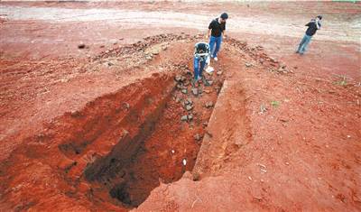 從山坡上可以看到出土漢代耳珰的平臺(tái)已經(jīng)被挖空了一大塊。據(jù)唐濤介紹:“6月初他們剛剛開(kāi)工不久,我們(郴州市文物管理處)6月4日就在這塊被挖空的平臺(tái)發(fā)現(xiàn)了一座漢代磚室墓,當(dāng)時(shí)下達(dá)了‘停工通知書’,告知建設(shè)方,需經(jīng)我們對(duì)墓葬發(fā)掘后才能再動(dòng)工。”但是一紙文書如石沉大海,郴州市文物管理處沒(méi)有接到建設(shè)方的任何回復(fù)。