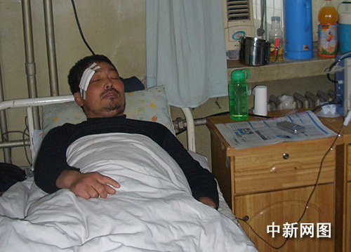 記者在石家莊市第二醫(yī)院骨科ICU病房見到霍辰輝時,他的眼部因縫合傷口還蒙著紗布,頭部被打部位還沒有消腫,因腰椎骨折不能下床的霍辰輝無奈地講述著那天的遭遇。