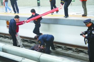 目擊者劉女士稱,墜軌事件發(fā)生在9時(shí)30分許,她當(dāng)時(shí)正在該站等地鐵,突然聽見刺耳的剎車聲,列車在進(jìn)站口就停下了,一個(gè)人臥倒在車前,地鐵員工等聞聲急忙前來救人。