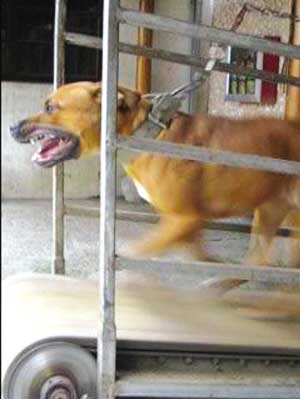 一條狗被拴在石磨推桿的架子上,它的前方掛著一籠子,為了追到籠子里的鴿子,狗不停地推著石磨繞圈跑,但它永遠追不到;跑步機上,同樣拴著一條狗,吐著舌頭,不停地奔跑……前天,一位游客在奉化民國大雜院旅游時,看到斗狗場的訓狗人員用這種方式訓練狗,以此來鍛煉狗的肌肉。這位游客認為,這屬于虐狗行為,應當制止。