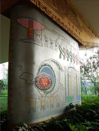 據(jù)有知情網(wǎng)友透露,這座“史上最牛的橋墩”來自四川德陽市鼓樓下的成綿高速高架橋橋墩。橫亙在鼓樓與廣場之間的高速公路橋墩,成了設(shè)計者發(fā)揮想象的地方。設(shè)計者將28個橋墩進(jìn)行裝飾改造,以仿古浮雕銅板扣畫和仿敲銀浮雕扣版畫及大型仿烙鐵裝飾畫體現(xiàn)德陽6縣(市、區(qū))歷史文化、風(fēng)景名勝、人文景觀及重裝基地風(fēng)采。整個壁畫長廊立體感極強,既抽象又寫實,色彩明朗,極具現(xiàn)代藝術(shù)風(fēng)格。彩虹橋、石刻、白馬關(guān)、龐統(tǒng)墓、倉山大樂、黃繼光紀(jì)念館、三星堆、年畫館、劍南春……德陽的標(biāo)志一一在此得以展現(xiàn),每個篇章把歷史文化、風(fēng)景名勝、人文景觀融為一體,形成一個完整的壁畫群落,壁畫面積達(dá)2309平方米,是整個德陽地區(qū)景點的微縮!笆飞献钆5臉蚨铡庇2007年初推出,并受到當(dāng)?shù)仡I(lǐng)導(dǎo)的表揚。