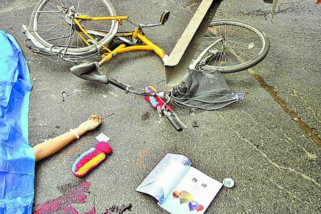 人群中,一名女孩蓋著無紡布,露出一只細(xì)嫩的胳膊,已被宣告身亡。女孩旁,留有一只彩色的毛線手套和一本包過封皮的八年級上冊物理課本,扉頁寫著趙悅的名字?拷沸牡囊粋(cè),一輛半舊的自行車已被壓成了“鐵餅”(如圖)。自行車車籃上,有一個鄭州市第102中學(xué)0168號存車牌。