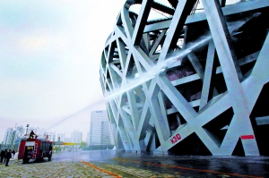 記者上午在現(xiàn)場看到,共有兩輛消防車已經(jīng)在鳥巢的西北側(cè)開始了清洗工作,高壓水槍將清水直接噴射到鳥巢縱橫交錯的鋼結(jié)構(gòu)外立面上,很多原本看上去落滿灰塵的地方都在清水的噴刷下瞬間恢復(fù)了鋼結(jié)構(gòu)原有的顏色和光澤。業(yè)主單位相關(guān)負(fù)責(zé)人介紹,由于鳥巢是獨(dú)特的鋼膜結(jié)構(gòu),用清水清洗主要是為了保護(hù)這些特殊的鋼結(jié)構(gòu)和膜結(jié)構(gòu)。