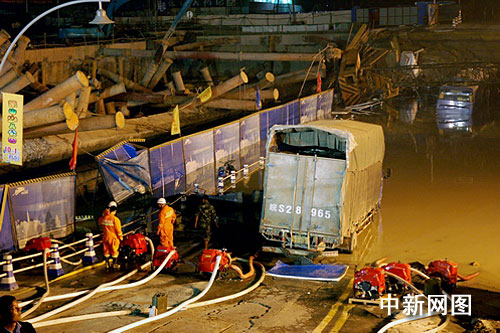 事故現(xiàn)場塌方造成施工工地結(jié)構(gòu)性坍塌,北二基坑塌方現(xiàn)場長120米、寬21米、深16米;公路塌方長50米、寬20米、深2米,1輛客車、1輛出租車、1輛貨車、7輛小車共10輛車陷入塌方現(xiàn)場,工地結(jié)構(gòu)性坍塌造成自來水鋼管斷裂,大量水涌出淹沒事故現(xiàn)場。