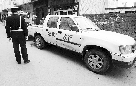 昨日上午,執(zhí)法局在孫八寨村內(nèi)找到了這輛山寨版執(zhí)法車(chē),當(dāng)即撥打電話(huà)報(bào)警,特巡警三大隊(duì)民警趕到現(xiàn)場(chǎng)后,得知車(chē)主去了北京,于是將車(chē)子拖進(jìn)了停車(chē)場(chǎng)。