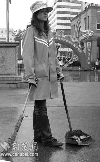 昨日下午2時(shí)許,在東方大酒店門前,記者終于找到了這位名叫余惠文的環(huán)衛(wèi)工。微風(fēng)細(xì)雨之中,她穿戴的環(huán)衛(wèi)服、環(huán)衛(wèi)帽似乎更顯出她高挑苗條的身材。盡管沒戴視頻中的墨鏡,但她薄施粉黛、畫了眉、涂了唇膏的臉更具風(fēng)情。