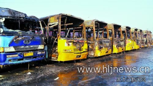 21日清晨,在哈市香坊區(qū)薛家屯208路公交車終點站停車場內(nèi),一輛雙燃料公交車點火啟動時,由于工人違章操作致化油器回火并引發(fā)火災,停放在該車兩側(cè)的8輛公交車和1輛貨車被殃及。